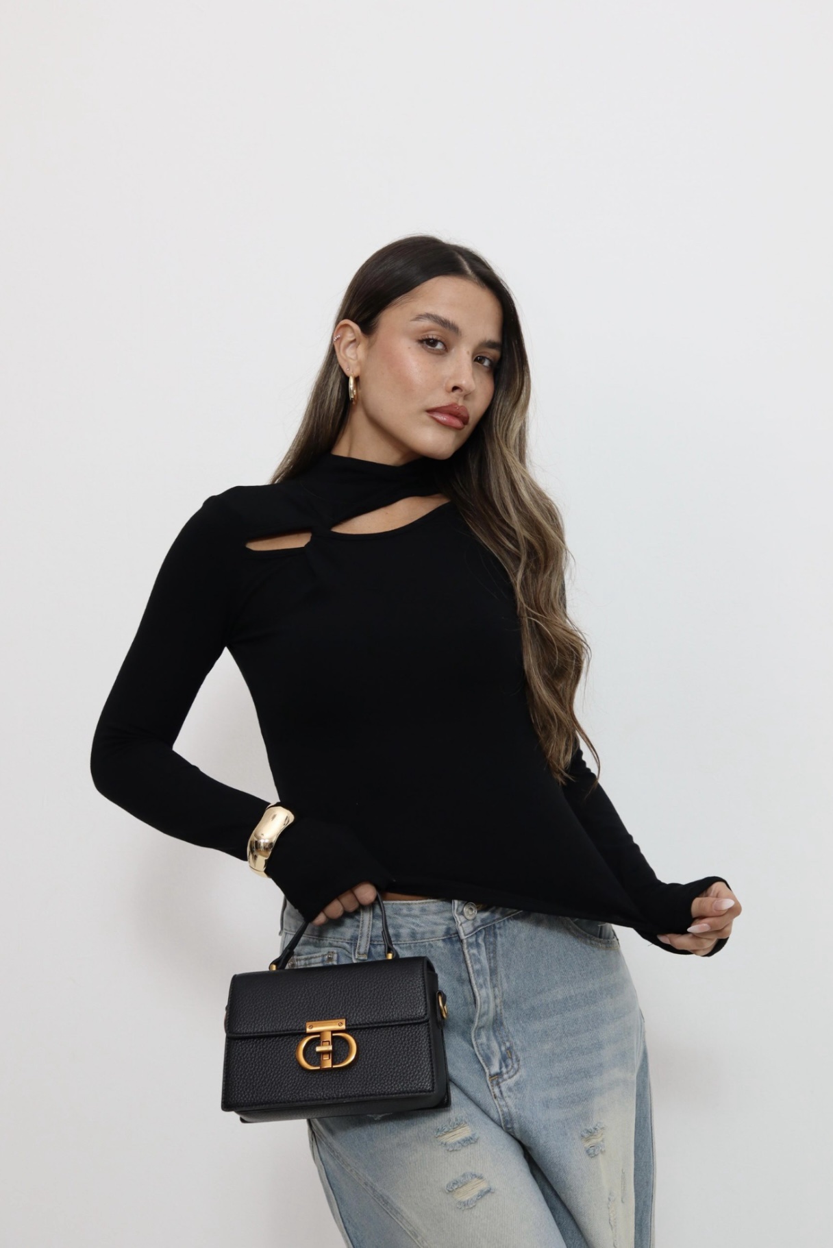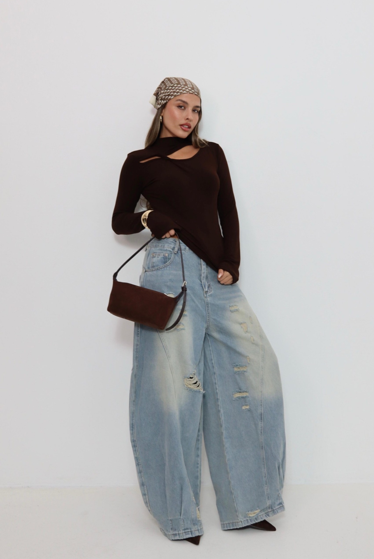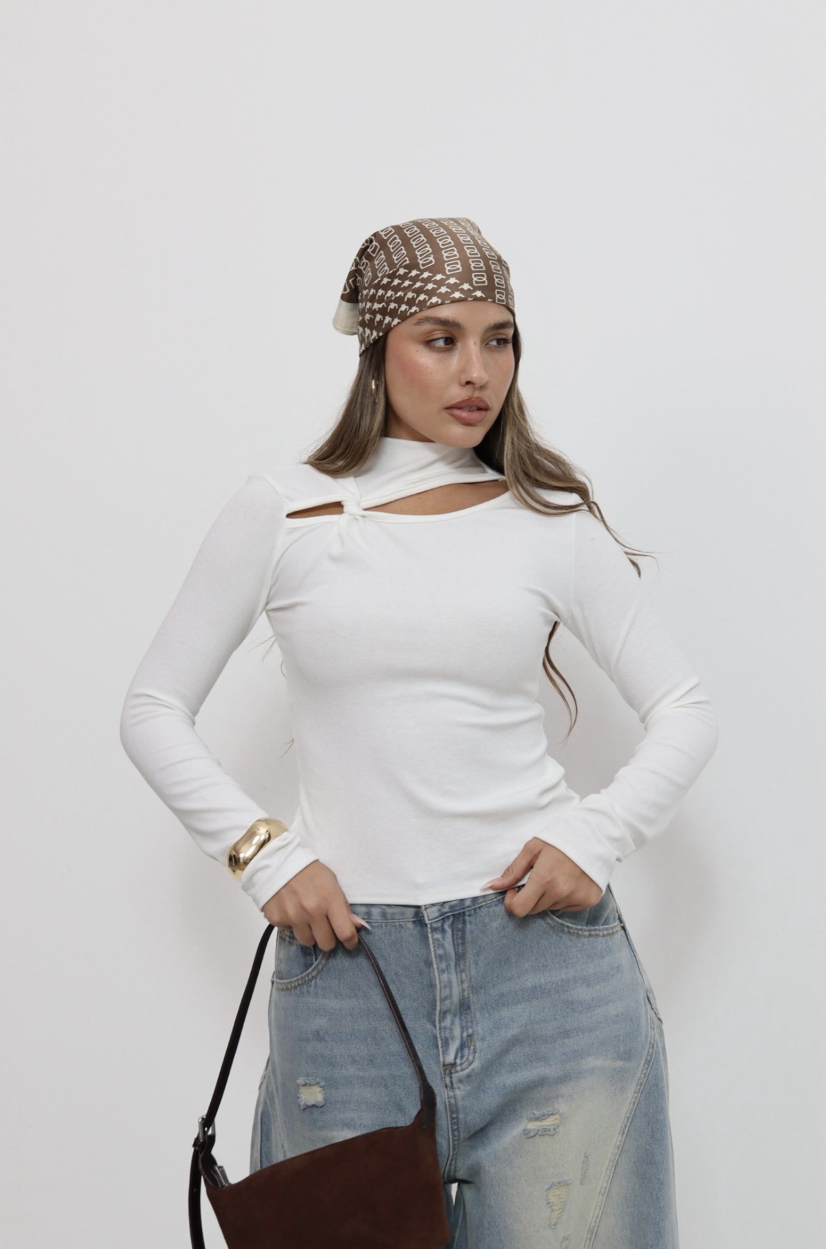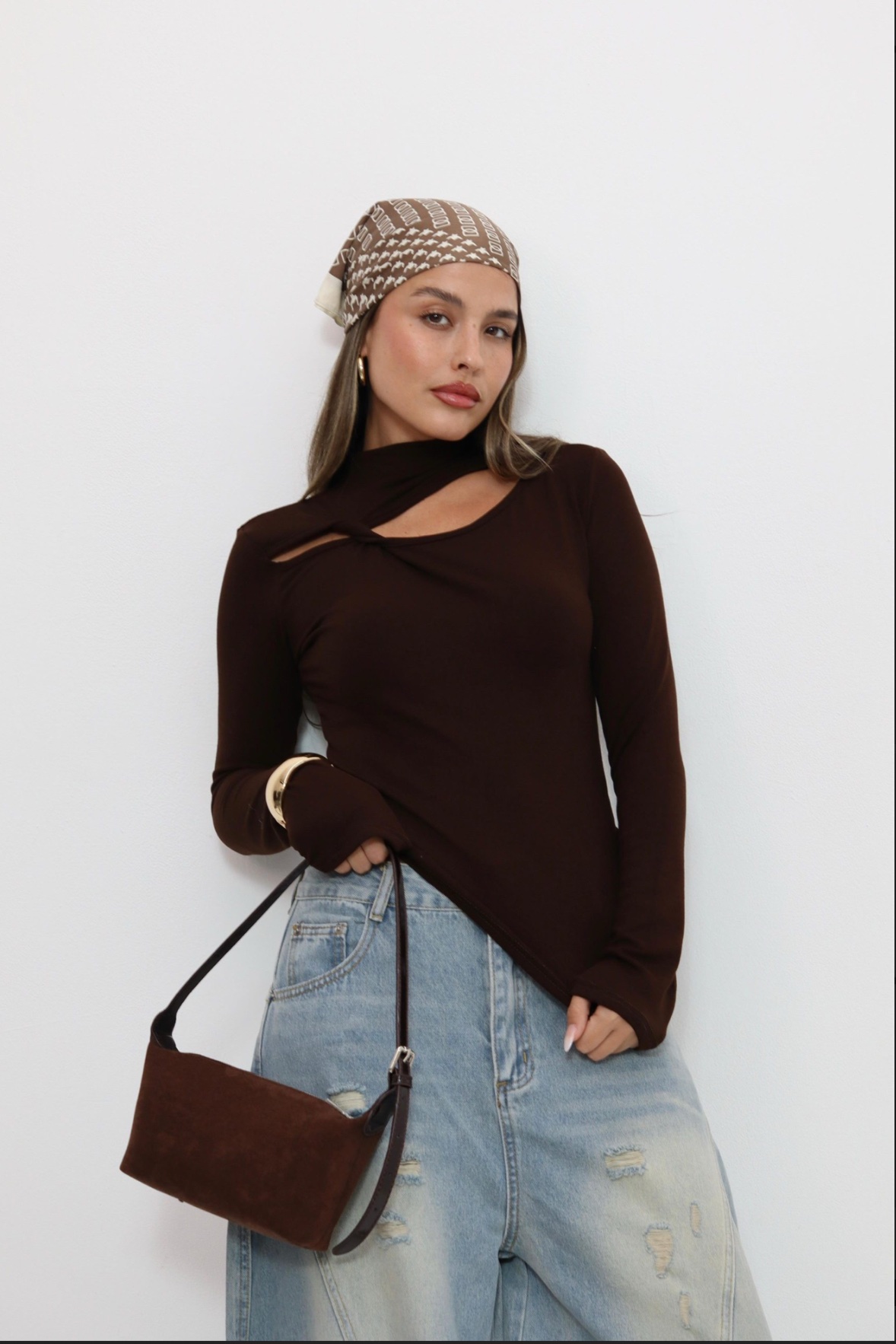 חולצה אופנתית בגזרה צמודה עם שרוולים ארוכים וחתך מעוצב באזור המחשוף, בגוונים חום, שחור ולבן. עשויה מבד נעים ורך למגע, מושלמת למראה אלגנטי עם טוויסט מודרני וייחודי.