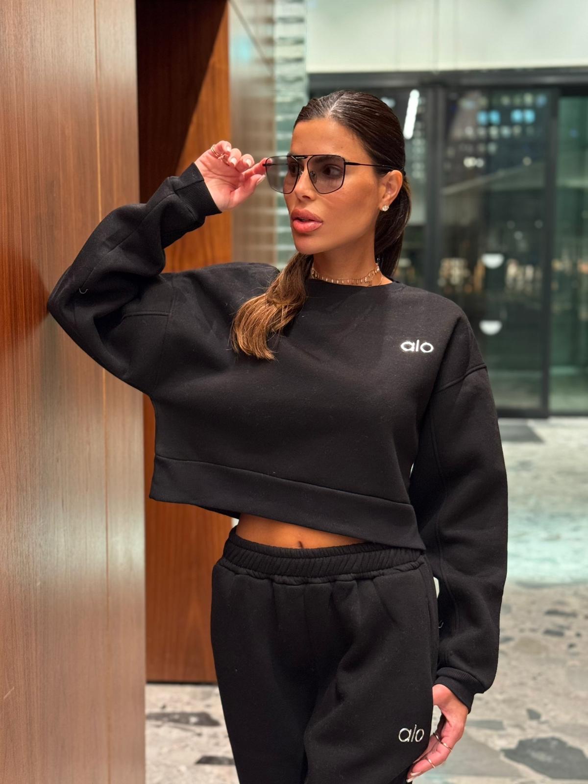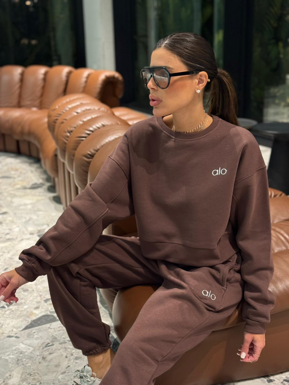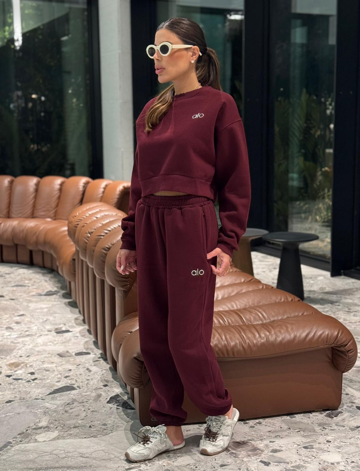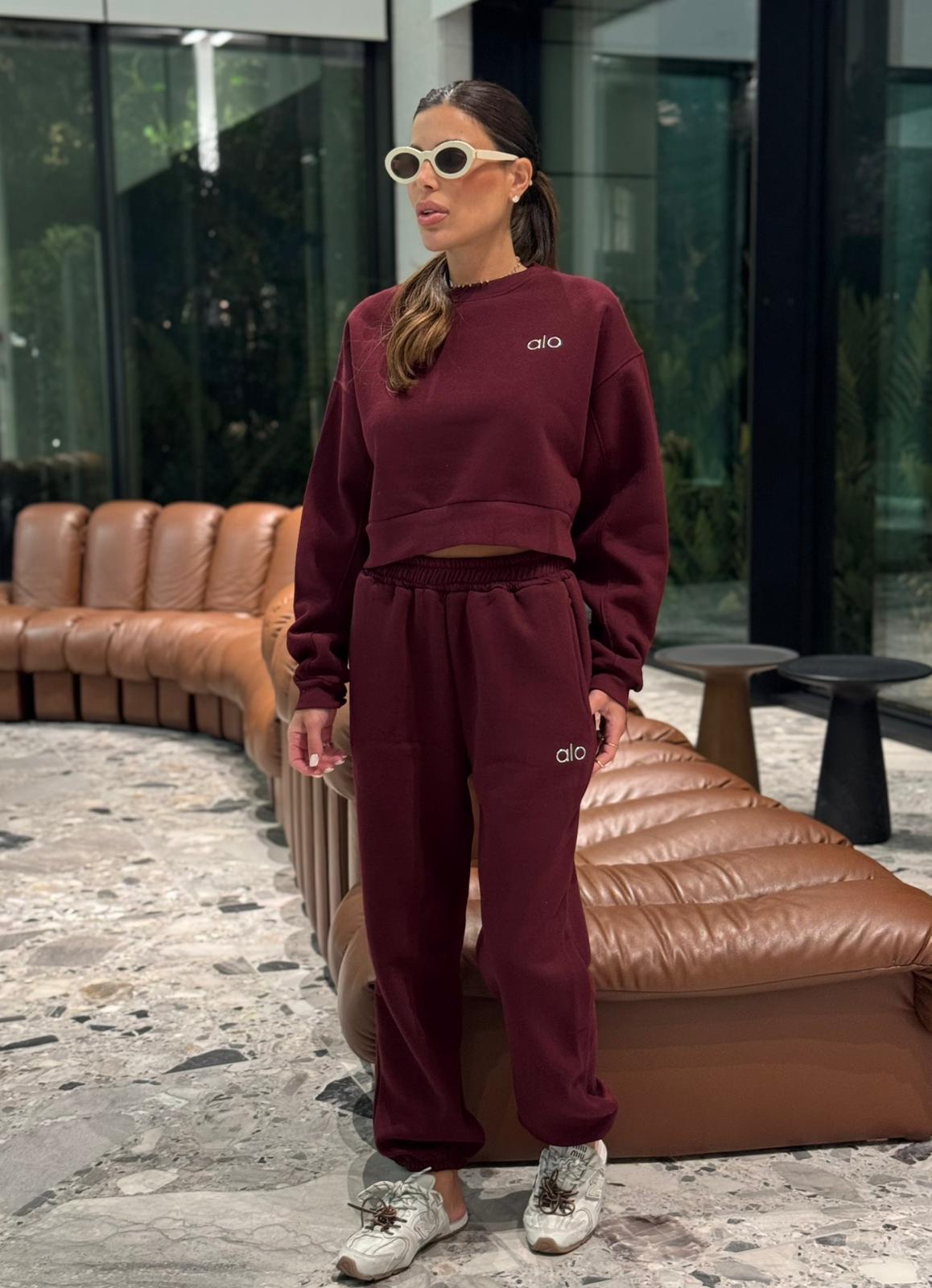 חליפת טרנינג נשים במגוון צבעים, הכוללת סווטשירט קצר ומכנס תואם עם גומי במותן ובמכפלים. עשויה מבד רך ונעים, עם לוגו “alo” רקום בחזה ובמכנס למראה ספורטיבי ואופנתי.