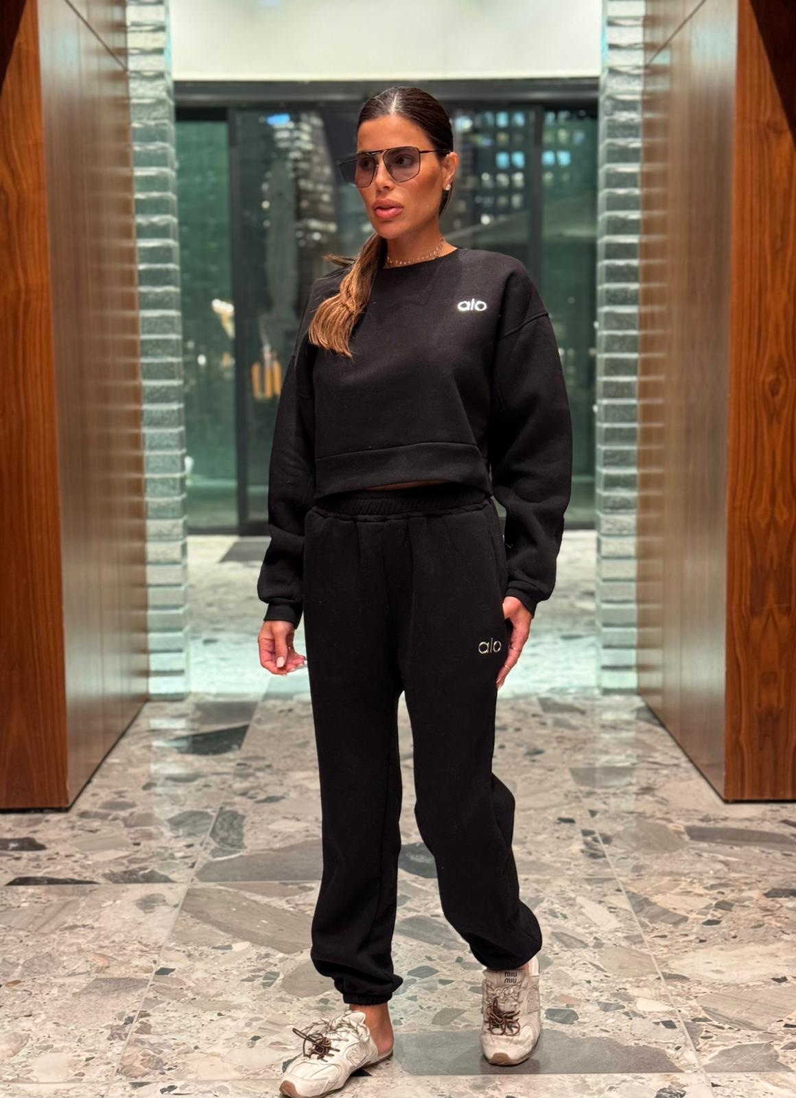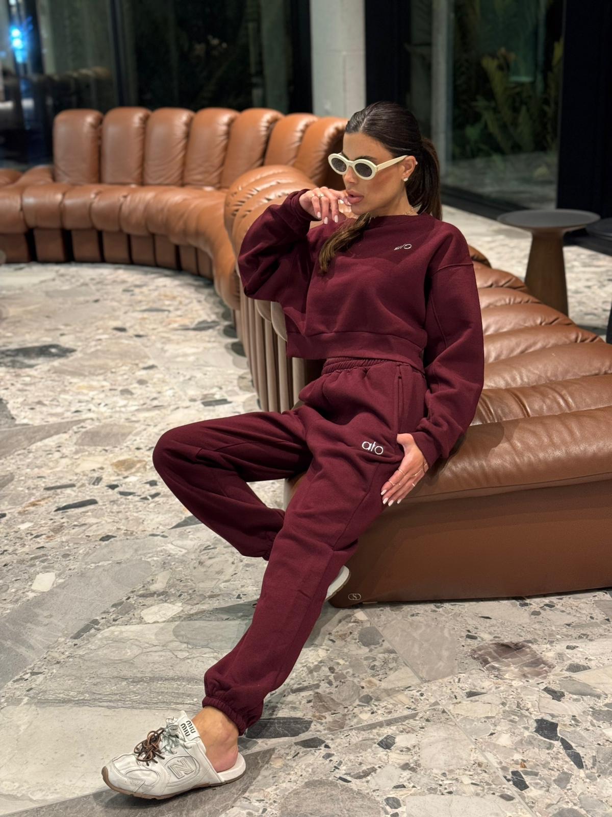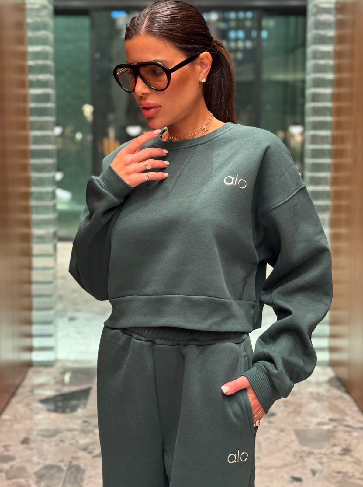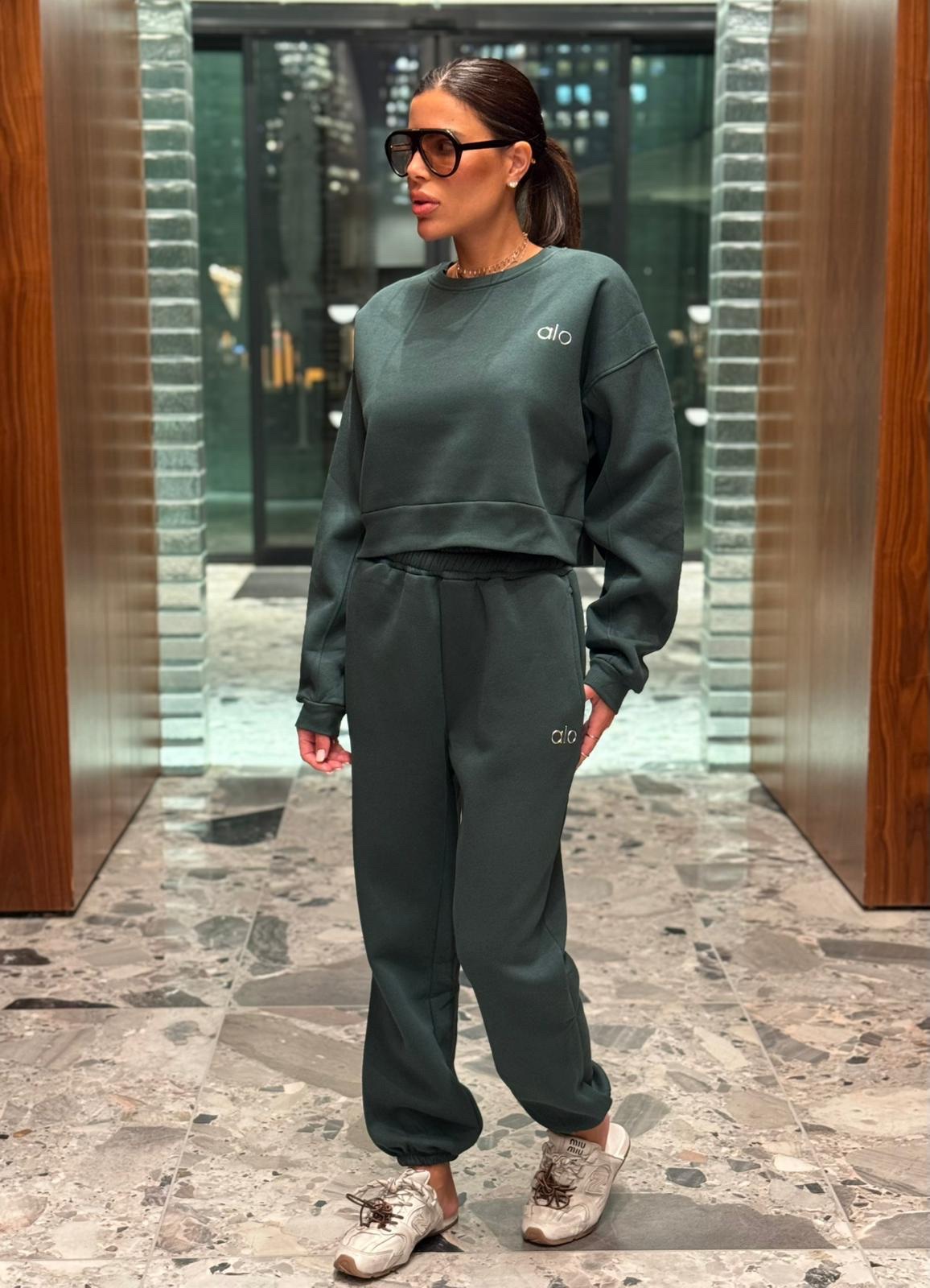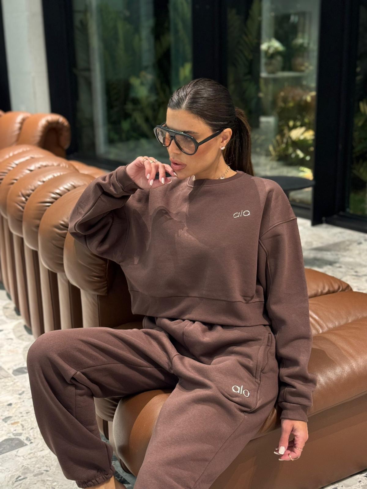 חליפת טרנינג נשים במגוון צבעים, הכוללת סווטשירט קצר ומכנס תואם עם גומי במותן ובמכפלים. עשויה מבד רך ונעים, עם לוגו “alo” רקום בחזה ובמכנס למראה ספורטיבי ואופנתי.