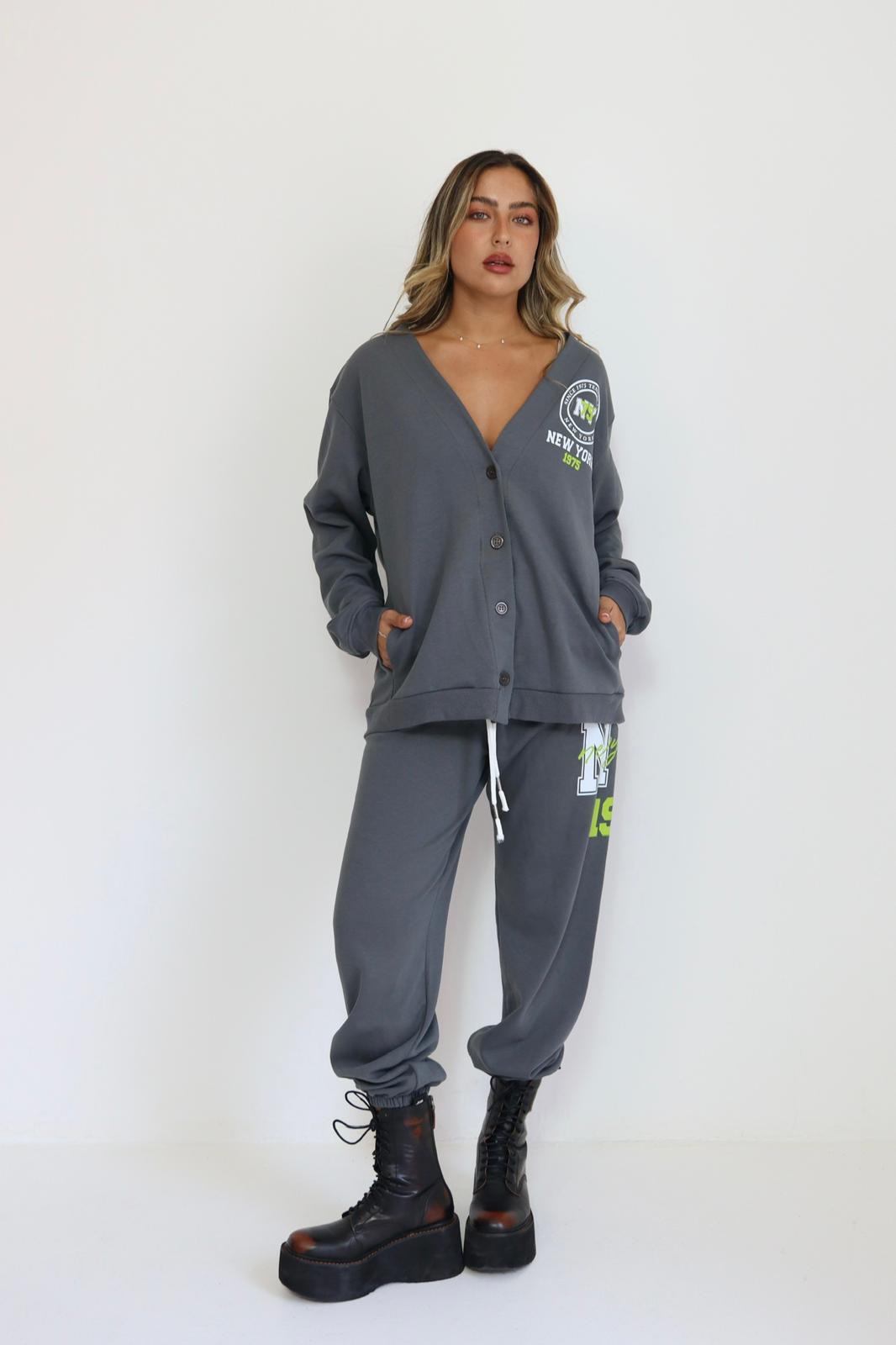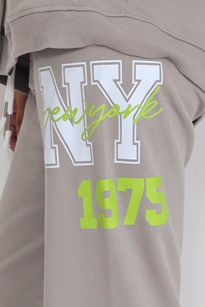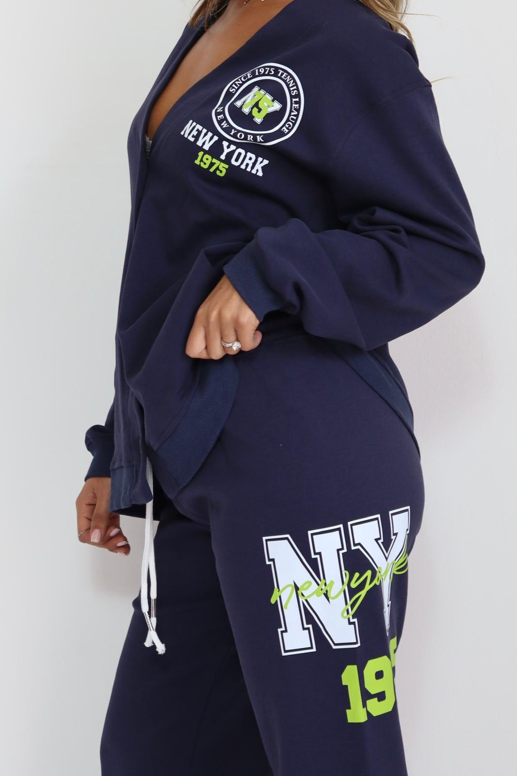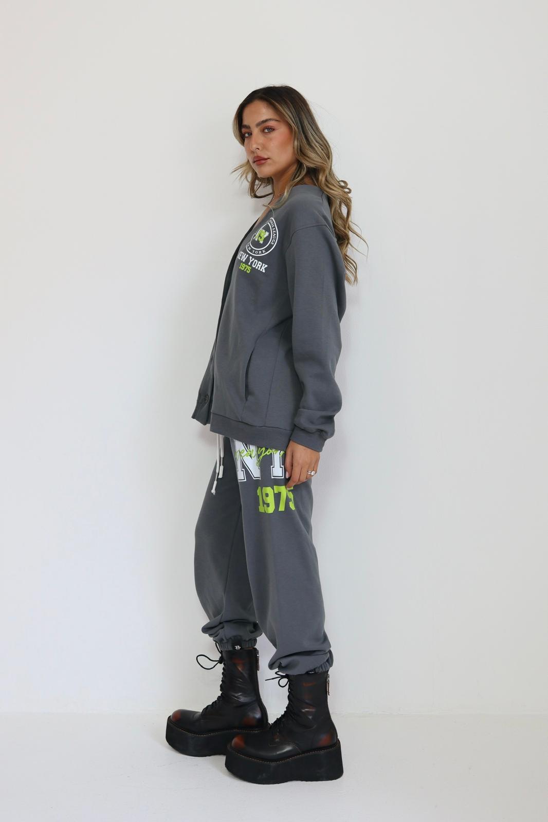 חליפת טרנינג מושלמת בלוק ניו-יורקי עם הדפסים מודגשים בגווני לבן וירוק ניאון. כוללת קפוצ’ון עם רוכסן ומכנס עם גומי ושרוך להתאמה מושלמת. סטייל יומיומי ונוח בווייב אורבני קולי.