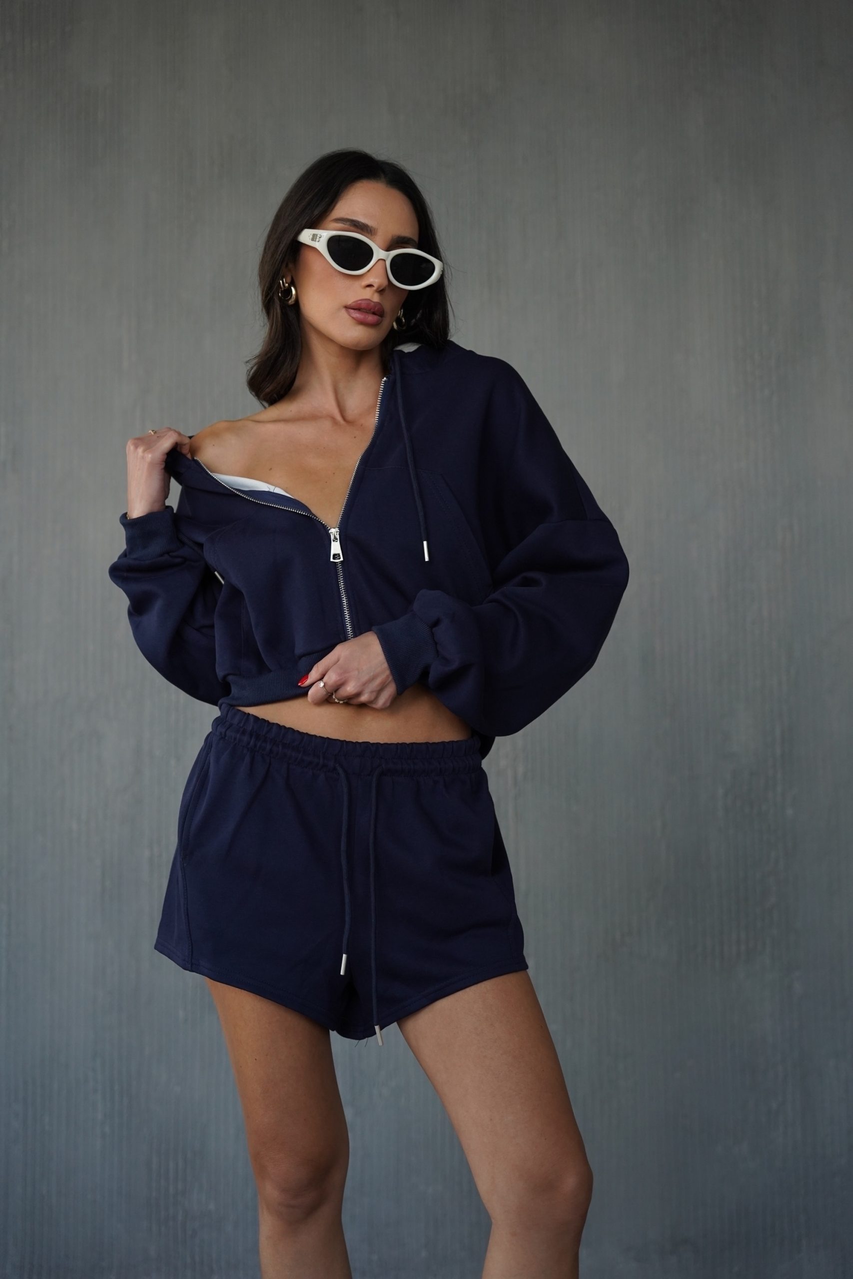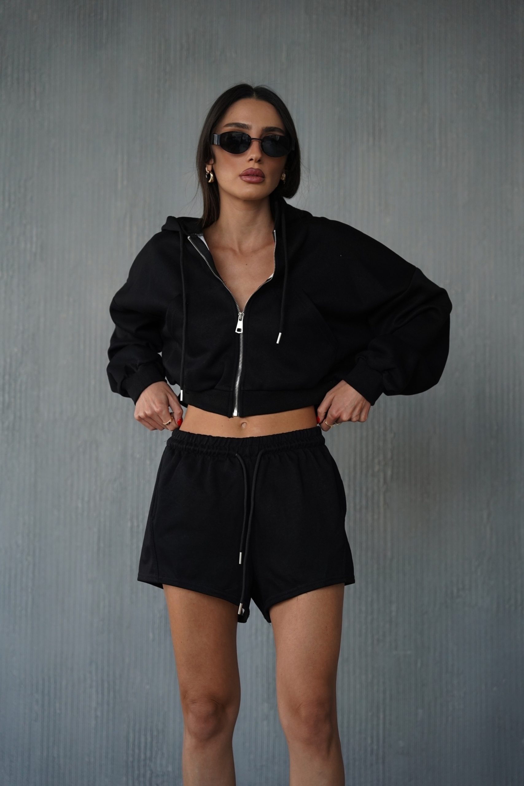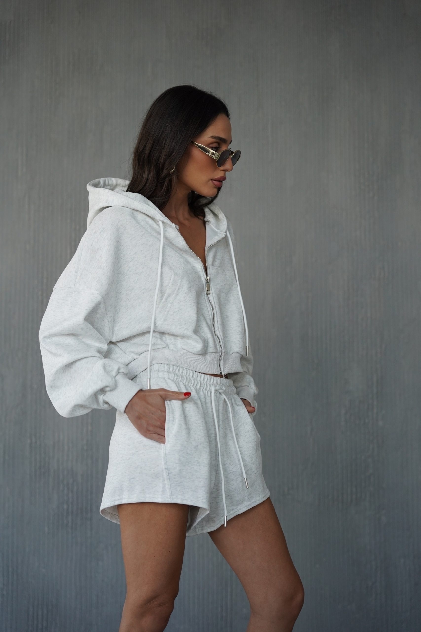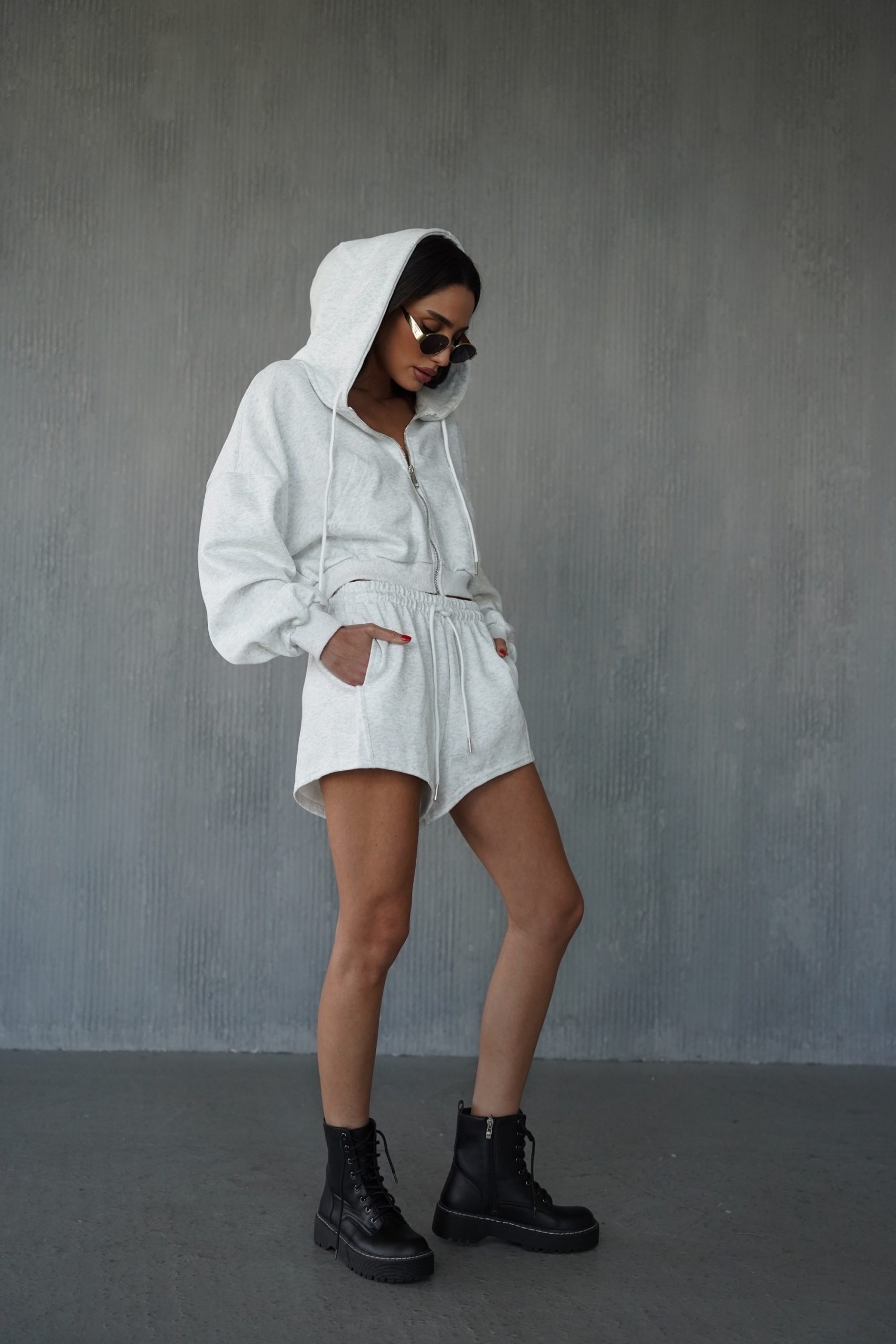 חליפה בעלת מראה ספורטיבי-יומיומי הכוללת מכנס קצר ונוח עם גומי במותן, בשילוב קפוצ’ון תואם עם כיס קנגורו וכובע מחובר. עשויה מבד נעים ורך, מתאימה לעונות המעבר או לערבים קרים בקיץ. מושלמת ללוק קז’ואלי ועדכני