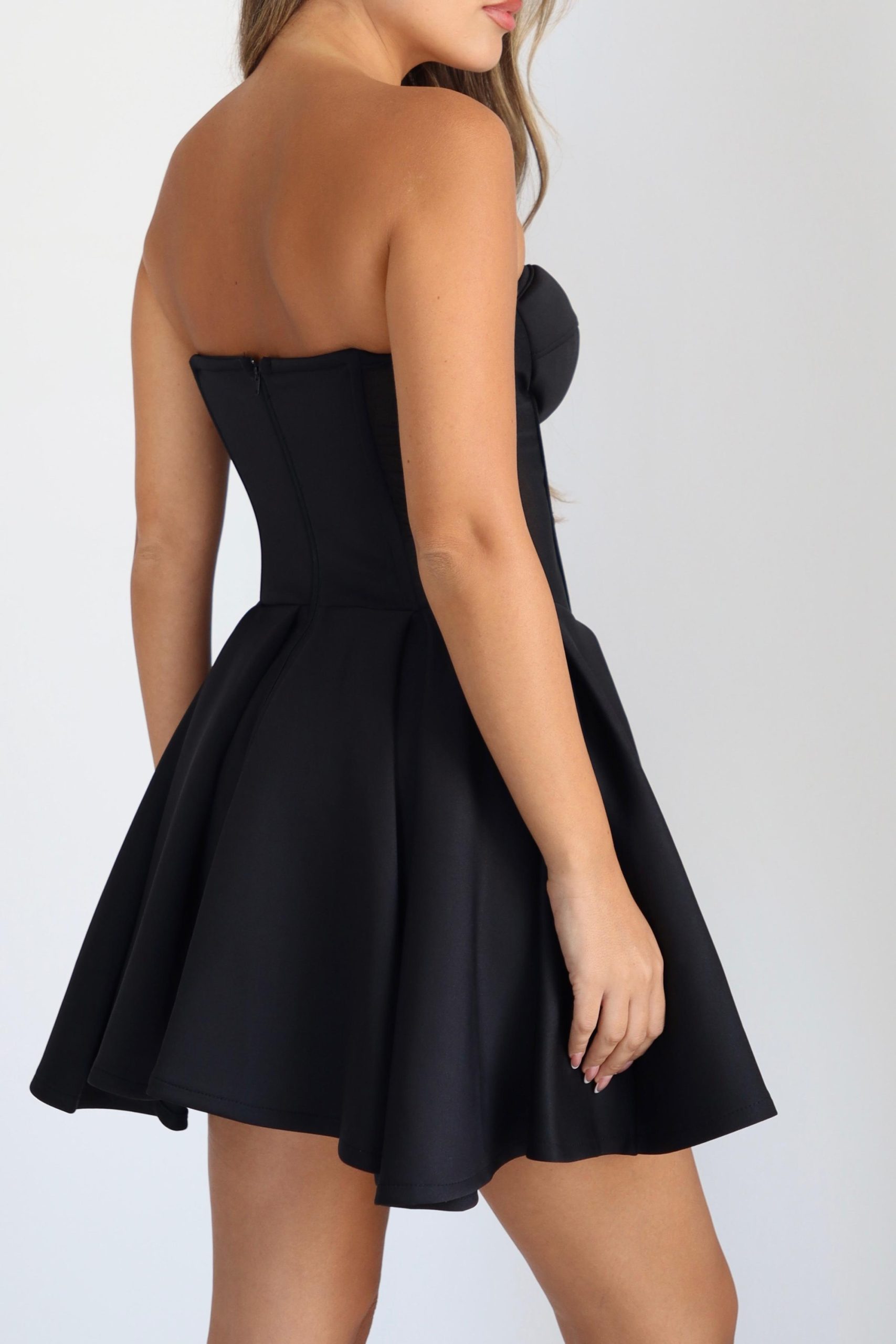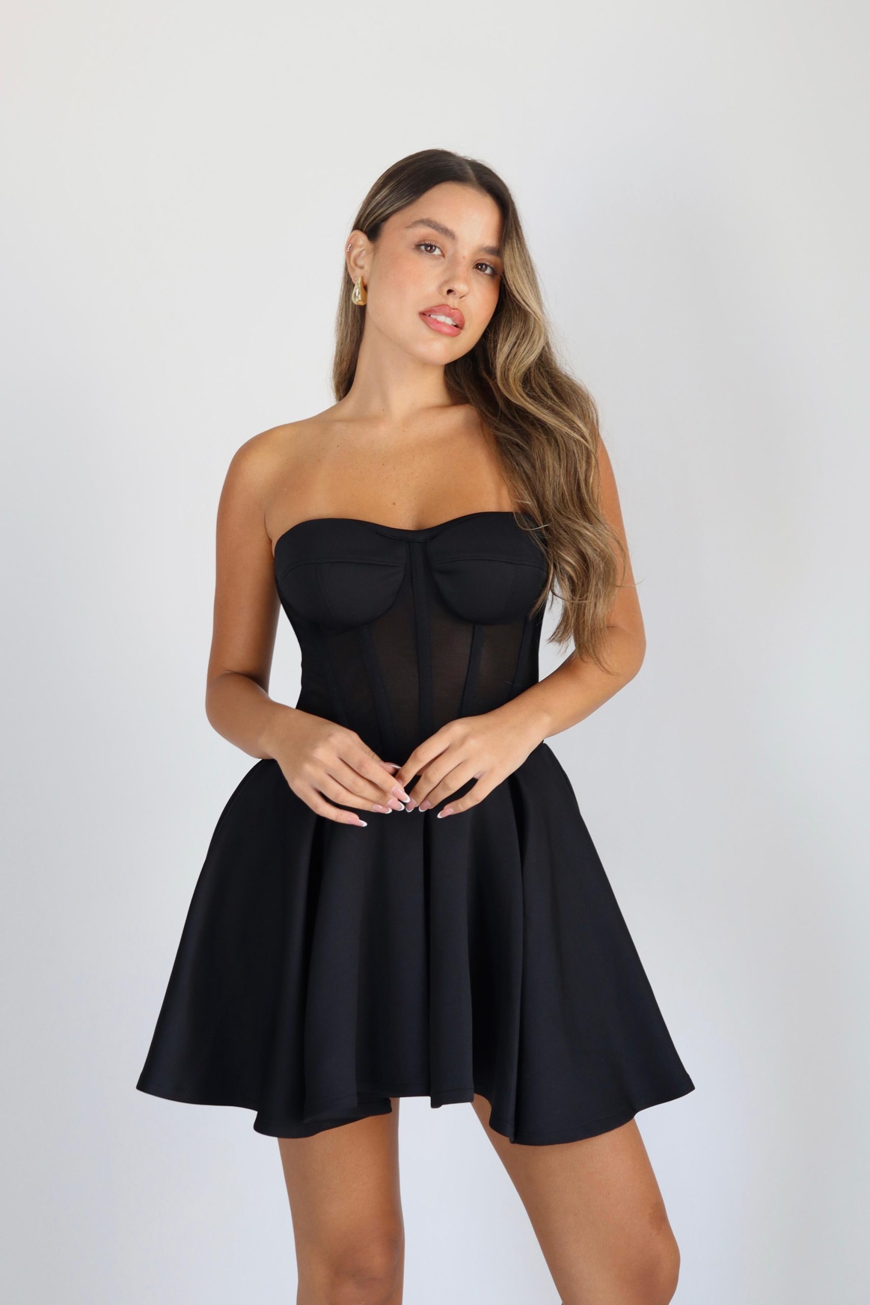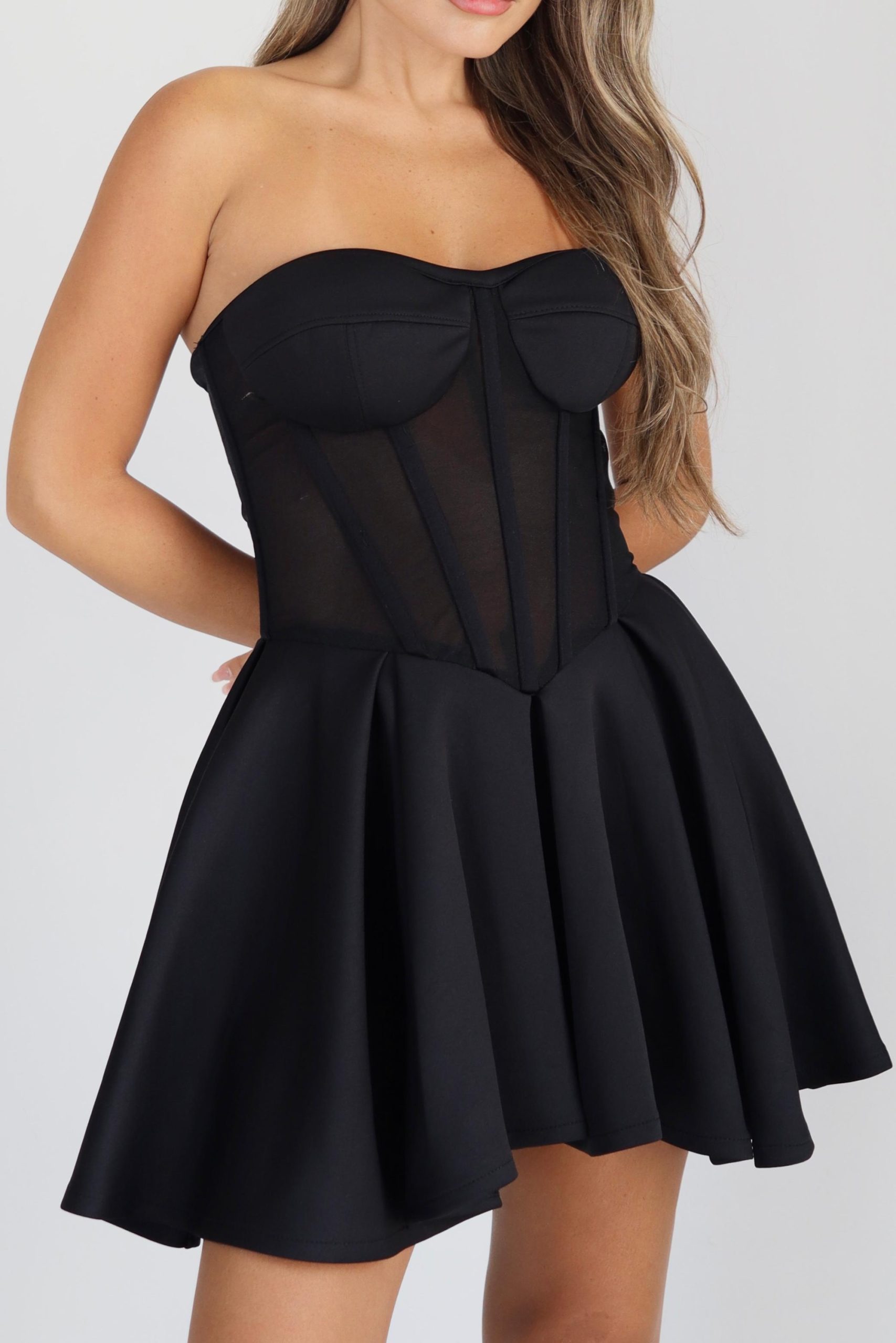 שמלה קצרה בסגנון מחוך עם חלק עליון שקוף ומחטב וחצאית קלוש רחבה ונשפכת. שילוב מושלם של מראה אלגנטי וסקסי ללוק ערב מרשים ונועז.