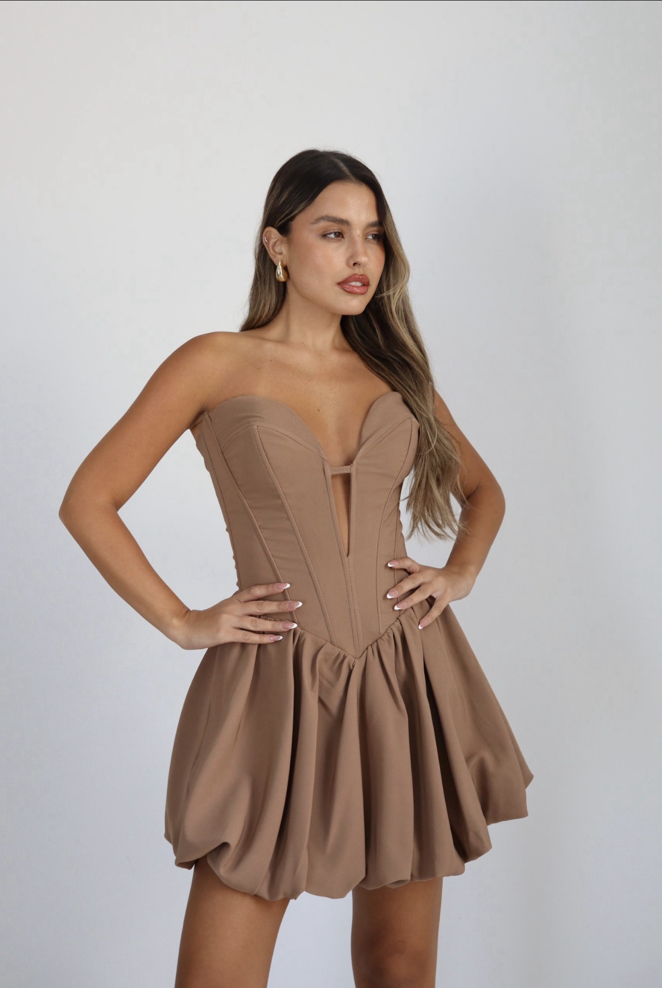 שמלה קצרה בסגנון מחוך עם מחשוף עמוק וחצאית נפוחה בגזרת בלון. שילוב מושלם של אלגנטיות ונועזות ללוק ערב זוהר ומחמיא.