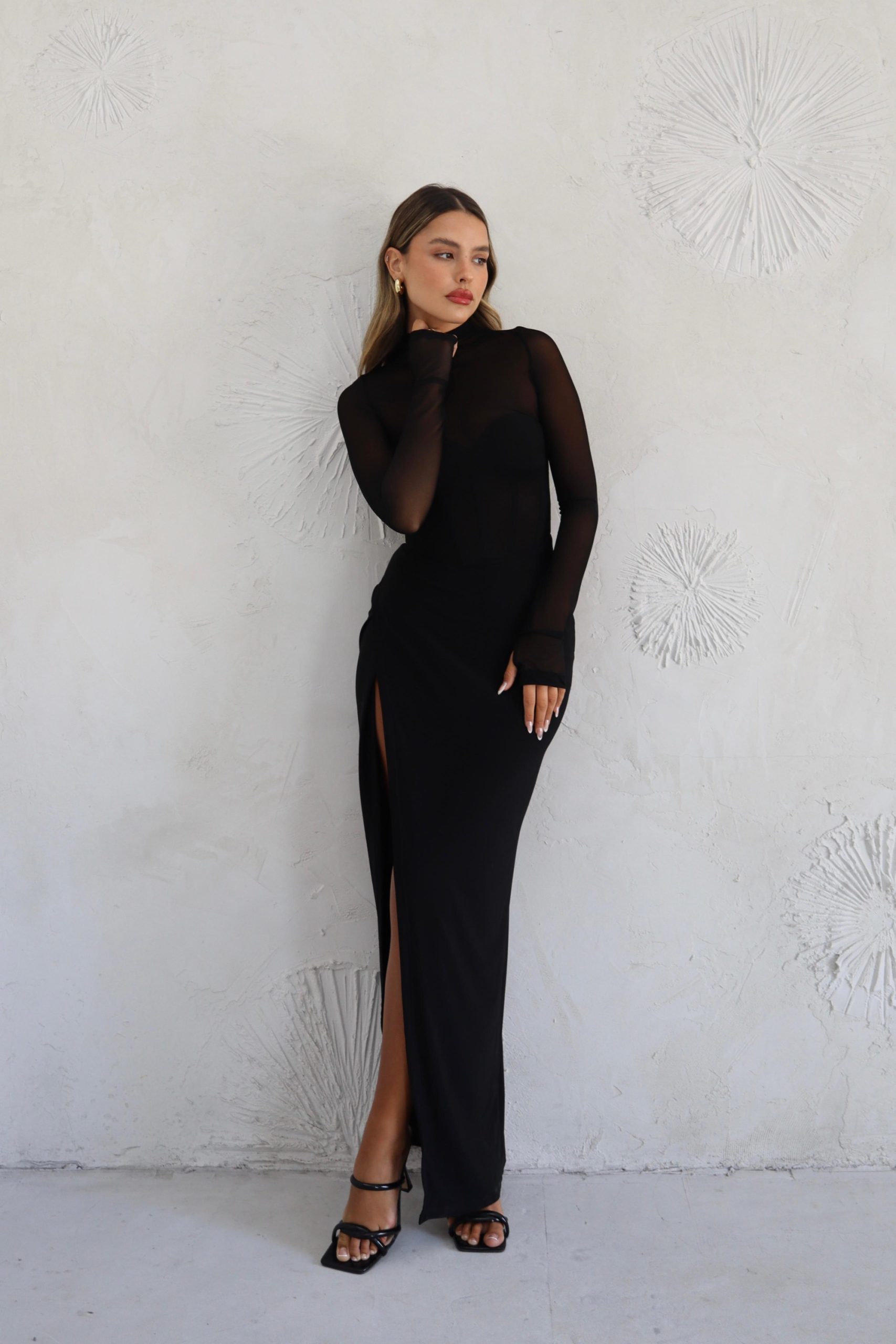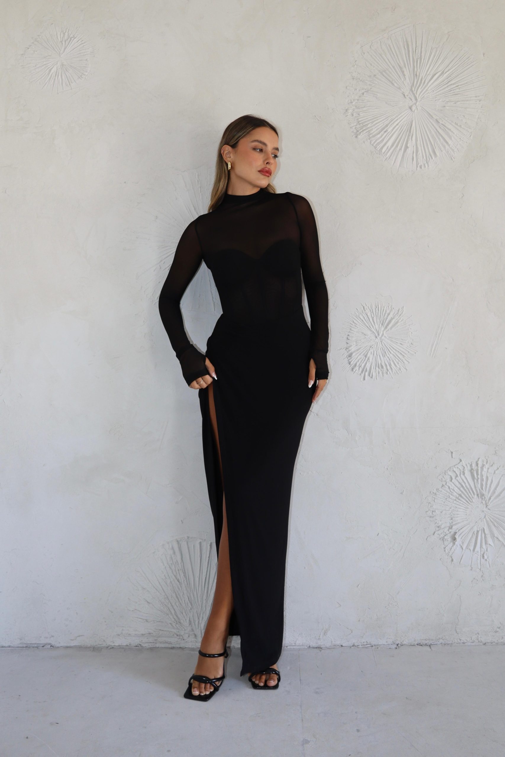 שמלה ארוכה אלגנטית עם חלק עליון שקוף ומחטב בגזרת גוף, צווארון סגור ושרוולים ארוכים. החצאית עם שסע גבוה שמוסיף נגיעה סקסית ומרשימה למראה ערב יוקרתי.