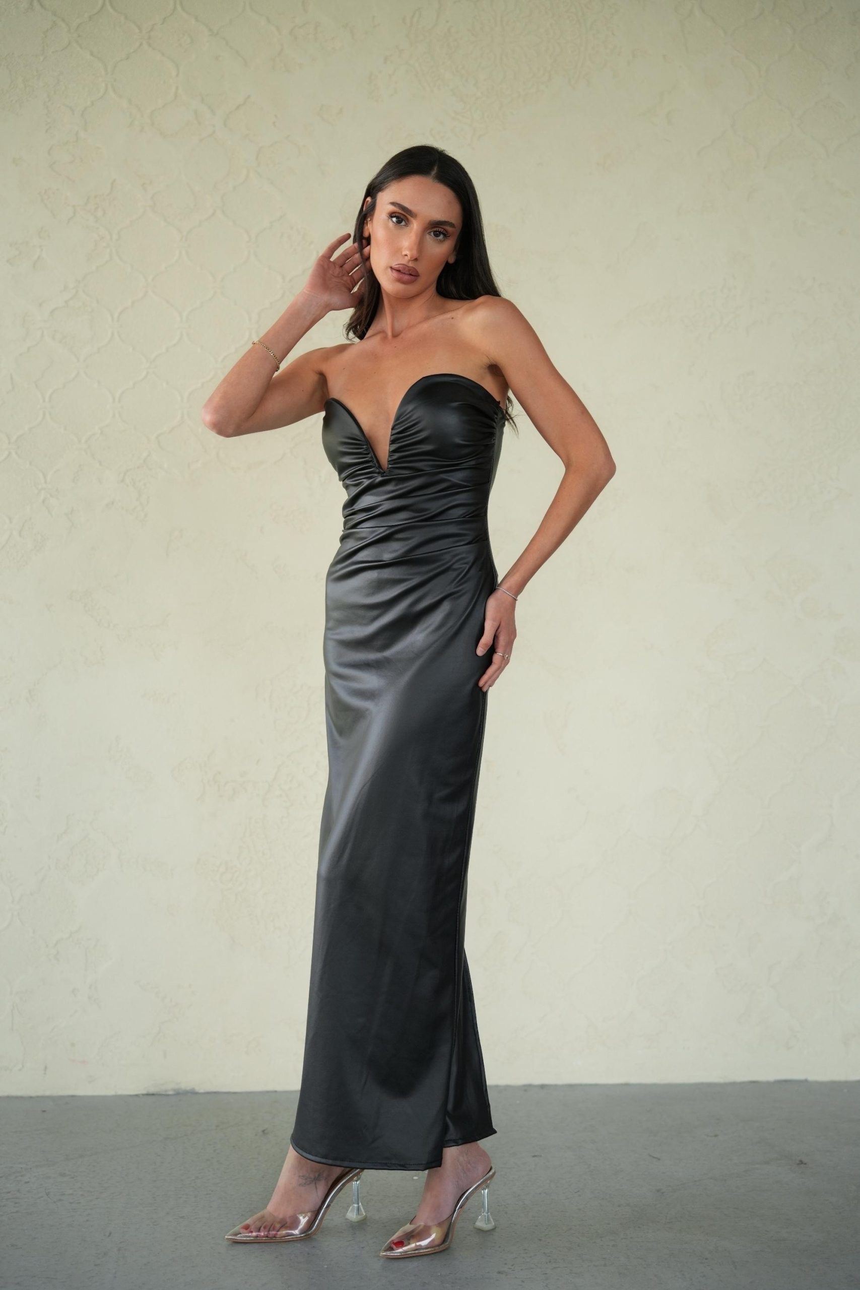 שמלת ערב שחורה מחויטת בגזרת סטרפלס צמודה, עשויה בד מבריק בסגנון דמוי עור. בעלת מחשוף עמוק ומחמיא עם כיווצים עדינים במותן המדגישים את הגזרה הנשית. מראה אלגנטי ונועז ללוק ערב יוקרתי ומרשים.